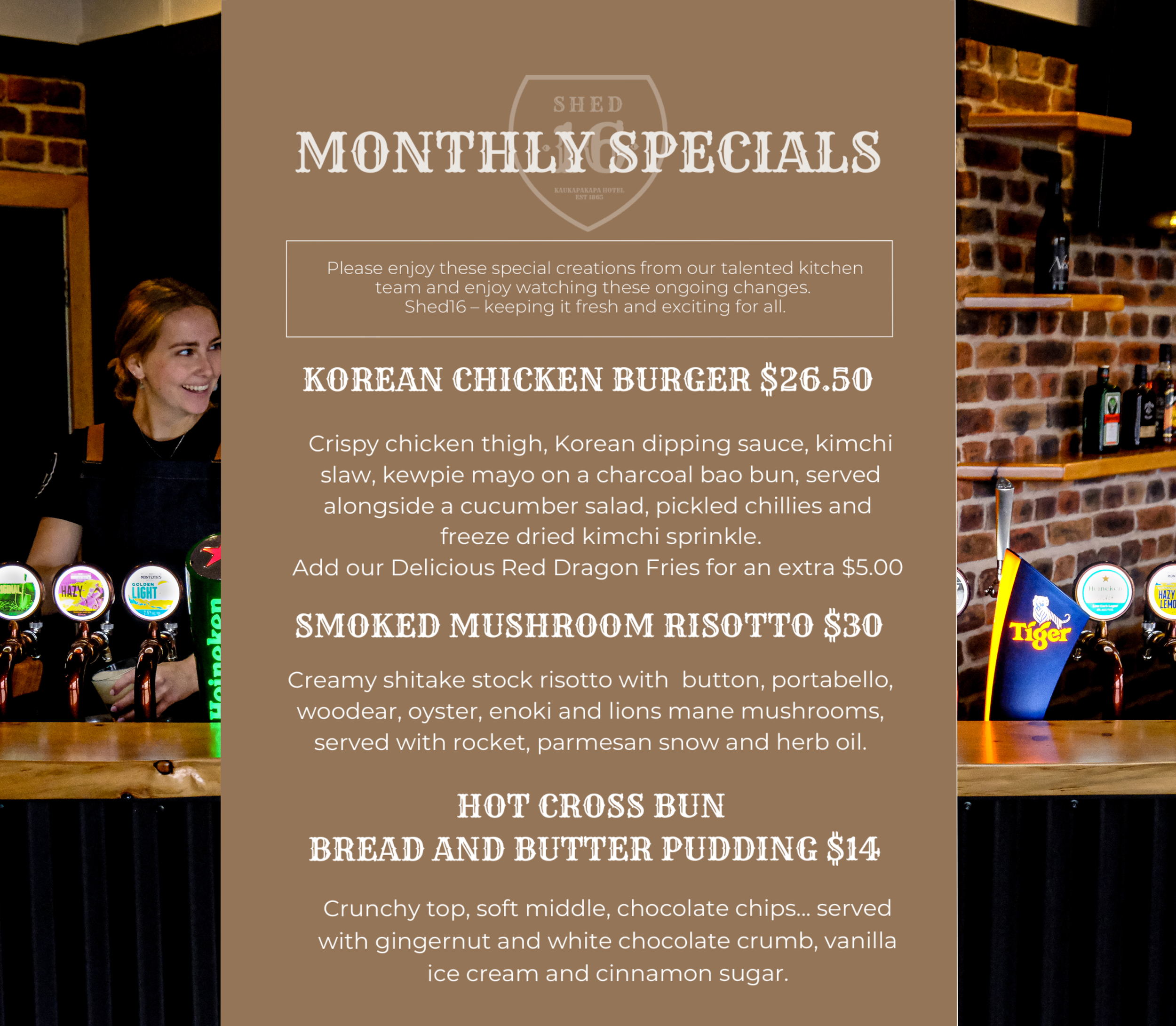 Kaukapakapa has had a pub since 1865, with many stories to tell. SHED16 offers a classic pub menu with modern twists, monthly specials, cold beers, fine wines, and traditional service. We would love for you to visit.